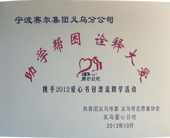10月,寧波賽爾集團收到了來自共青團義烏市委、義烏市志愿者協會以及義烏市愛心公社送來的“2012愛心書包漂流助學活動”的牌匾。