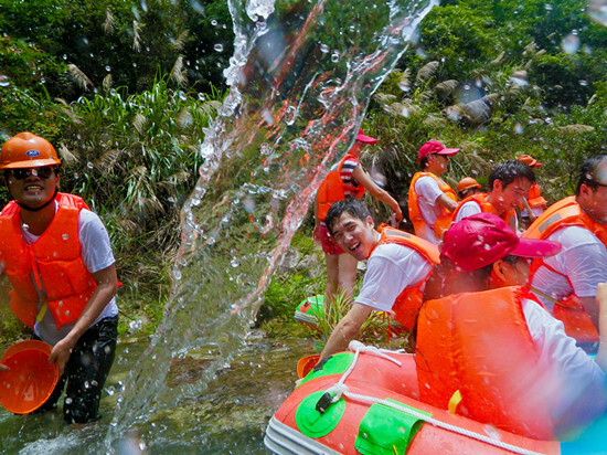清涼水花飛濺引來(lái)女生們的聲聲尖叫,男生們則吼著嗓子大喊爽快。崎嶇的漂流水道驚險(xiǎn)刺激,橡皮船橫沖直撞,險(xiǎn)些卡在突起的石塊中間,很快就被后續(xù)飛沖下來(lái)的橡皮船撞開(kāi),猶如一場(chǎng)激烈的水上碰碰車大戰(zhàn)。每到一個(gè)水流平穩(wěn)的地方,部分男同事棄船蹲點(diǎn),準(zhǔn)備好滿滿的水,等待著被水流沖下來(lái)的同事展開(kāi)密集的潑水攻勢(shì),女生們力氣不敵男生最終敗下陣來(lái)舉白旗投降,有些男同事奮起對(duì)戰(zhàn)猛烈潑水,卻也因寡不敵眾輸?shù)脩K烈。