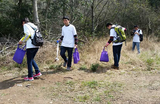 早晨9點,我們抵達活動第一站:奉化市北坑嶺古道。北坑嶺古道比較原生態,一路上盡是迷人的風景,大家一邊欣賞沿途美景,一邊撿拾沿途的塑料袋、飲料瓶等垃圾。由于前段時間連日陰雨,山路有些濕滑,男生們紛紛主動攙扶著女生做起了“護花使者”。一路上走走停停,歡快的氣氛一掃旅途的勞累,大家很快抵達山頂。
