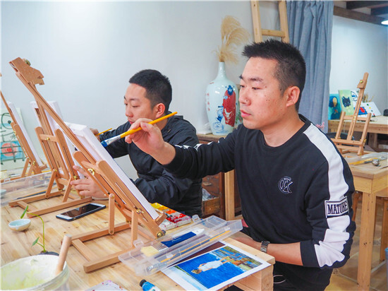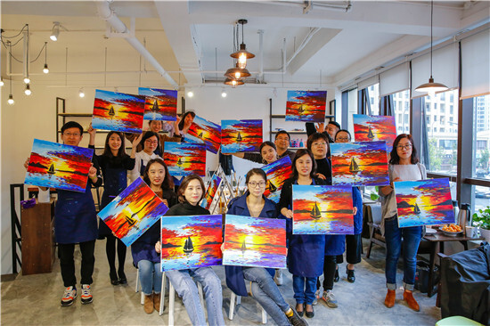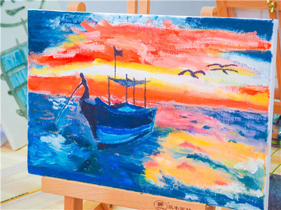 油畫一側(cè),畫架擺上,顏料備好,圍裙一系,專業(yè)的畫師模樣出來了!男老師畫畫真的比較罕見,這細(xì)致活需要耐心。經(jīng)過近2個小時的創(chuàng)作,一副副油畫作品出來了,寧波講師統(tǒng)一創(chuàng)作了“海上帆船”,沒有對比就沒有傷害哦。義烏講師就各顯神通了:有爸爸和媽媽和女兒一起創(chuàng)作的最紅社會人“小豬佩奇”;有自創(chuàng)作品“書香四溢”,出自桂東東老師之手,簡約卻不失神韻哦!