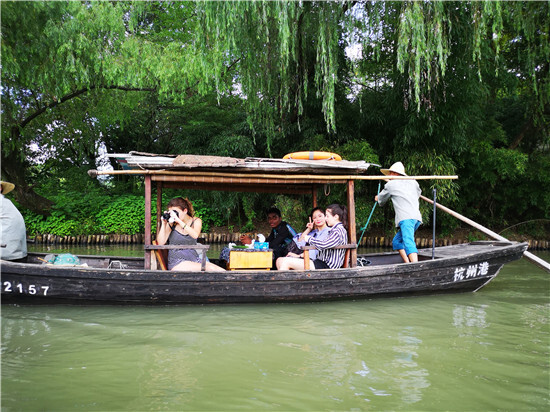 第一站是非誠勿擾拍攝地西溪濕地,我們此次摒棄傳統的參觀模式,當半天菜農,做半天漁夫。我們先到了西溪的菜地,每個人發了一個摘菜用的筐,留學生看著各種蔬菜不知道從哪里下手。在菜園的農夫熱情的介紹后,他們馬上沖了進去,黃瓜、茄子、絲瓜、豆角,都紛紛落入筐中。
