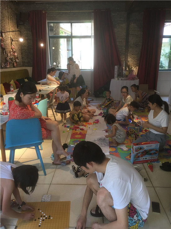 8月4日,天氣晴朗,優(yōu)景公司第一屆親子活動(dòng)在大步里院拉開了序幕。共有13組家庭報(bào)名參加,其中3-5歲的寶貝居多。早上9點(diǎn)半,大家陸續(xù)來到大步里院,孩子們一看見我們?yōu)樗麄兙臏?zhǔn)備的畫板、水彩筆、印章等玩具,都迫不及待地脫掉鞋子,來到EVA墊子上,歡快地玩耍起來。