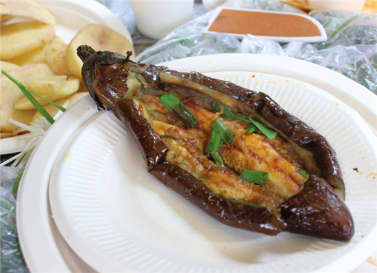 采購張總獨家秘制的烤茄子,這賣相可以登得大雅之堂了吧?可惜美食曇花一現,瞬間就被幾雙筷子干掉了。
