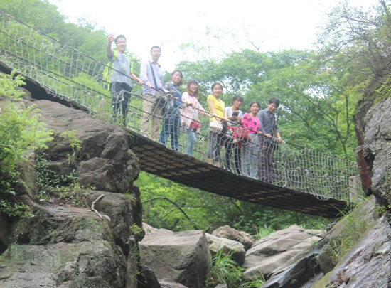 山澗的水,嘩啦啦留著;懸空的橋,我們走著嘎吱嘎響著。