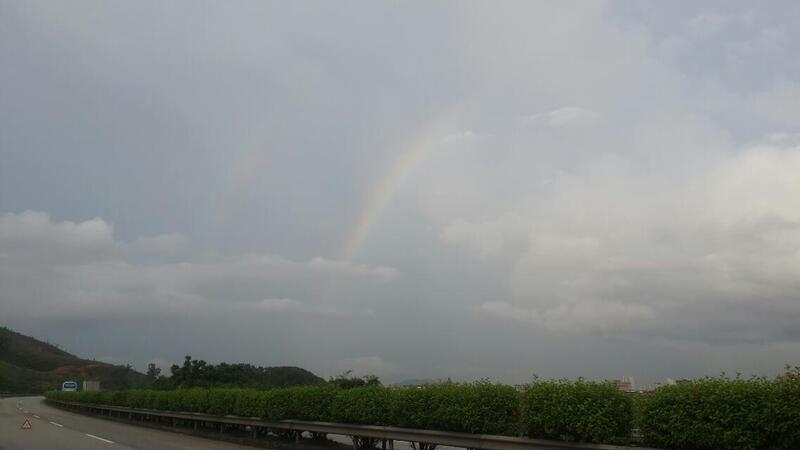 出發了,高速路上堵車堵了11個小時,下完大暴雨,又餓又累,大家都下車觀看雙彩虹,可謂苦中作樂啊。