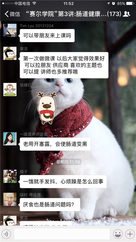 2月16日,賽爾學院開設首次微信課程——《腸道的健康與管理》。本次課程受到了集團同事的廣泛關注,短短幾天時間就有170余人報名。到了上課的日子,群里的小伙伴很早就發來消息,已經做好準備,就等老師上課了。