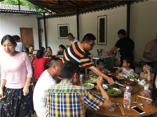 到達(dá)山莊后,映入眼簾的是各種土灶,背靠大山,雨后空氣特別清新。大家都開始忙碌起來,洗菜的、切菜的、用小刷子刷著小龍蝦的,大家互相幫忙,有序地準(zhǔn)備食材。
