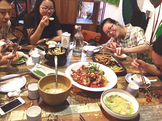一片笑聲中,太陽不知不覺已經下山了。民以食為天,“時光餐廳”就是我們的下一站。抬頭一看,一塊塊階梯組成的小魚形象,栩栩如生;腳下又是一個個玻璃瓶蓋組成的特色的“時年”,歡迎儀式獨具一格。在美味中,大家你一言我一語,果然是時光流年~