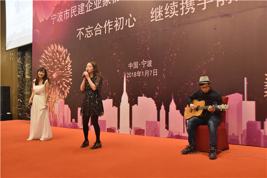 1月7日,寧波市民建企業家協會年會在華僑豪生大酒店舉行。徐平炬總裁作為協會會長,選送了曲目《fly me to the moon》作為年會節目,由愛樂社馬錦宇、胡佳楠以及特邀嘉賓賴耀峰老師為晚宴開場獻唱。一曲英文歌完美融合了吉他、美聲、爵士、流行等多種音樂元素,帶給了大家不一樣的視聽享受。