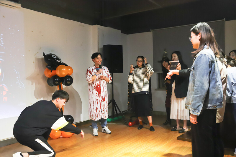 萬圣節怎么可以少了trick or treat 的樂趣呢?一進門,身著女巫斗篷的工作人員就為每位入場的朋友分發了炫彩糖果。身著血淋淋醫生服和搞怪僵尸服的兩大男主持宣布活動開場。話音剛落,由舞蹈社社長陳雪君扮演的白衣女鬼帶領兩大門鬼及兩位男主持貢獻了詭異又搞笑的開場舞,瞬間活躍起了現場氣氛。