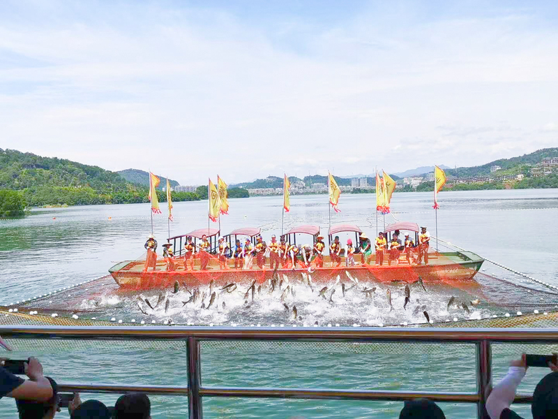 第二天吃完早飯,我們乘上豪華游艇,觀賞美麗的千島湖,享受難得的休閑時光。最后一個項目是參觀巨型網捕魚,收網前,魚兒們前仆后繼地跳出水面,水花四濺,頗為壯觀。