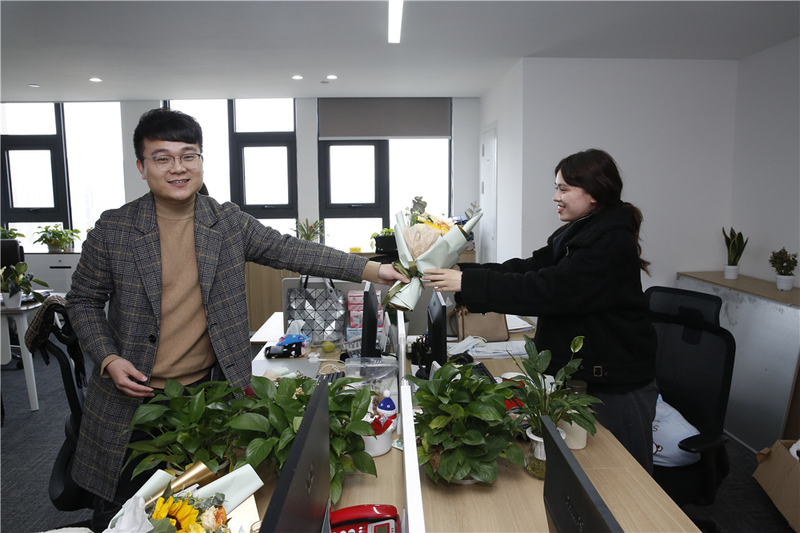 在女神節這個特殊的日子里,綠時為每一位女生都送上了最真摯的祝福。隨著公司里響起了《我是女生》的活潑旋律,男生們拿著鮮花出現了!