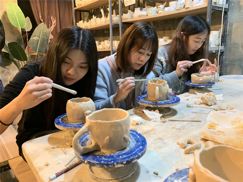 當(dāng)天中午,大家約在鼓樓的“桃妝”吃飯,這是一家老網(wǎng)紅,菜色和環(huán)境都很不錯。最有特色的就是桃花酒啦,很值得一品,我們豪氣地一人來了一碗,干杯!午餐結(jié)束后則是最期待的陶藝DIY時間。大家各自選好想要制作的作品,開始埋頭認(rèn)真制作。大家都是第一次做陶藝,手藝生疏得很,還好有老師指點,做出來的作品也都富有特色。
