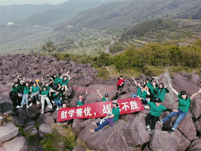 村頭后便是覆卮山景區(qū)了,放眼望去,滿是山野綠色。我們攜手踏過千年梯田,攀爬萬年石浪,敲擊冰山響石。在頂峰處,大家拉起橫幅大喊口號一起合影留念,在這田園美景世外桃源中,留下了珍貴的記憶。