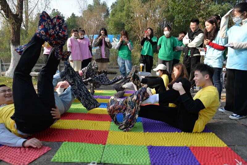偌大的場地,繽紛的游戲,指壓板、撕名牌等綜藝中能看到的游戲應有盡有,同事們奉獻一場精彩的“奔跑吧”決戰。大家通過抽取名牌的方式隨機分成4組,熟悉組員后便開始激烈的游戲。首先進行指壓板上穿花褲和計步器跳舞,每支隊伍在指壓板上合格地穿上花褲盡情跳舞,最后憑借計步器上的最終數字確定勝者。指壓板上,大伙兒瞬間貢獻出無數個表情包,引得周邊群眾一片笑聲。愛的魔力轉圈圈中,要求隊伍在不用手的情況下,將纏繞在身上的布條轉移到下一名隊員身上,用時最短的隊伍獲勝。隨后進行的音樂競跑和叢林冒險環節里,幾支隊伍互有勝負,不相上下。