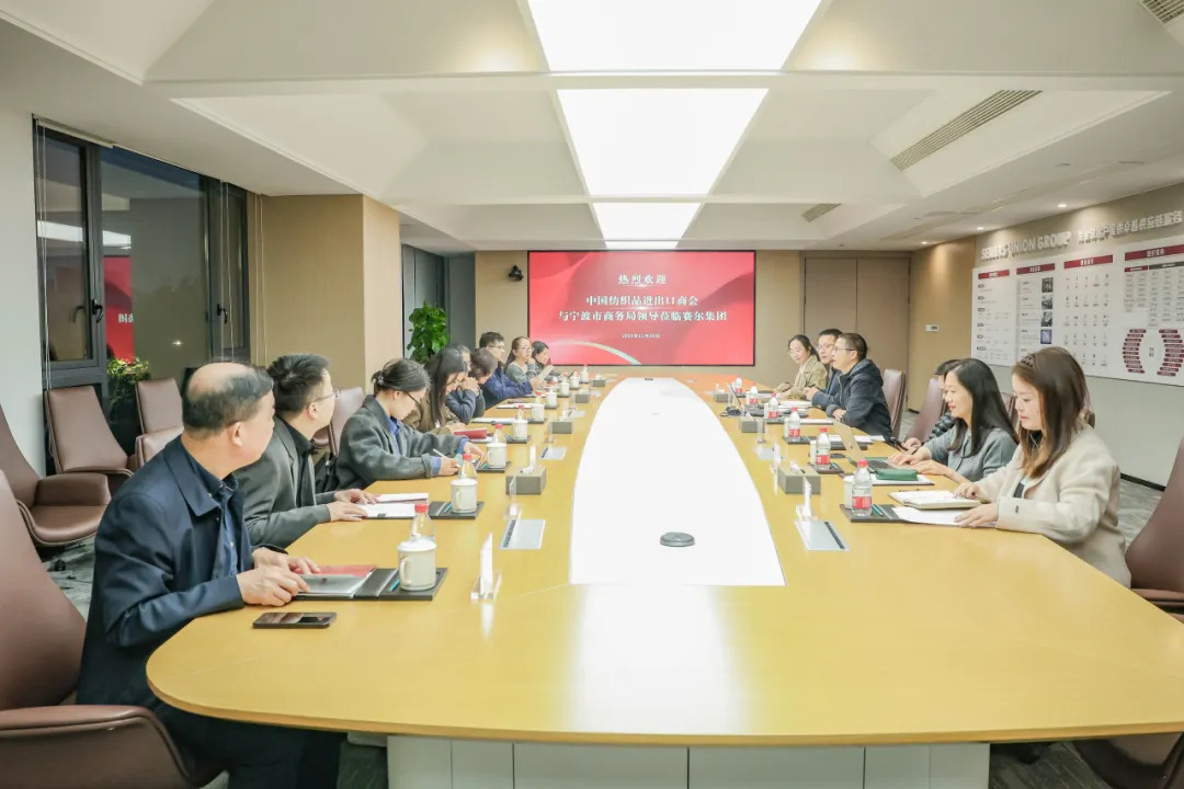 11月25日下午,中國(guó)紡織品進(jìn)出口商會(huì)曹甲昌會(huì)長(zhǎng)、會(huì)員部副主任苗青芳等一行來(lái)賽爾集團(tuán)走訪調(diào)研。寧波市商務(wù)局黨組副書(shū)記、副局長(zhǎng)、二級(jí)巡視員韓雋、市商務(wù)局貿(mào)促處處長(zhǎng)張陽(yáng)松、貿(mào)促處副處長(zhǎng)馬建萍等陪同調(diào)研,賽爾集團(tuán)董事長(zhǎng)徐平炬、副董事長(zhǎng)聯(lián)席總裁陳勇珍、總裁助理馬科成、集團(tuán)行政副總經(jīng)理方芳、優(yōu)勝公司副總經(jīng)理張怡和業(yè)務(wù)副總監(jiān)胡穎等熱情接待。
