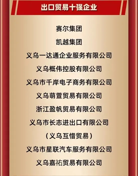 勇立潮頭,擔當使命丨賽爾集團榮獲2024年義烏市出口貿易十強企業